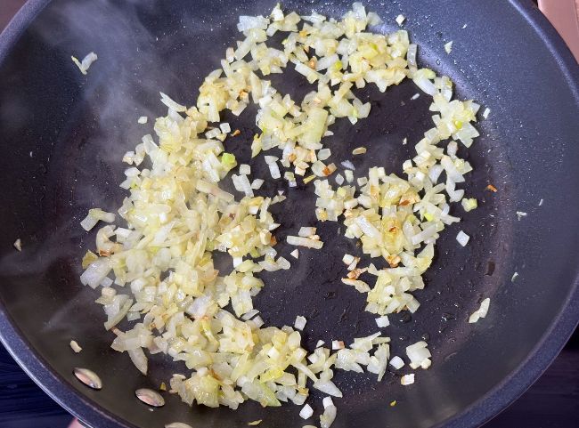 - Schäle den Knoblauch und die Zwiebel. Schneide beides in kleine Würfel. Erhitze das Olivenöl in einer Pfanne und brate die Zwiebel- und Knoblauchwürfel darin an.