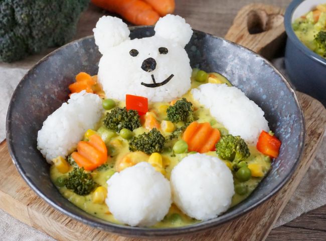 Wenn du das Gemüsecurry für Kinder besonders hübsch anrichten möchtest, kannst du wie auf meinem Bild einen Reis-Teddybär formen. Das geht am besten, wenn du dich für Sushi Reis als Beilage entscheidest. Das Formen geht am besten mit angefeuchteten Händen - so bleibt der Reis nicht kleben. Als Augen und Mund dient uns ein zurecht geschnittenes Noriblatt.