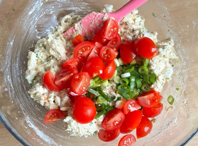 - Tomatenstücke, Lauchzwiebelringe und Petersilie oder anderes Gemüse nach Wahl untermischen