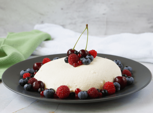 - Nimm die Joghurtbombe am nächsten Tag aus dem Kühlschrank und stürze sie vorsichtig auf einen großen Teller. Garniere sie mit frischen Früchten der Saison, Beeren aus der Kühltruhe oder auch mit Roter Grütze und serviere sie deinen staunenden Gästen.