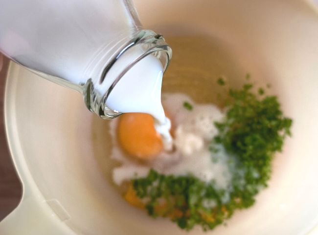 - Gib die Milch mit dem Mehl, den Eiern, Haferflocken, den gehackten Kräutern und Salz in eine Schüssel.