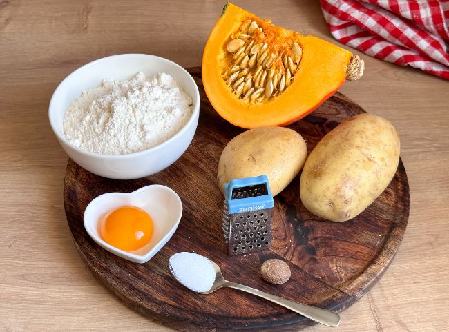 - Schäle die Kartoffeln, schneide den Kürbis klein. Gib beides in einen Topf mit Wasser. Koche das Gemüse 25 Minuten weich. Drücke die Kartoffeln und den Kürbis durch die Kartoffelpresse. Lass die Mischung abkühlen.