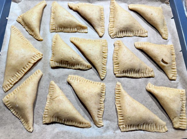 - Heize den Ofen auf 200°C Ober-/Unterhitze vor. Lege die veganen Apfeltaschen auf ein mit Backpapier belegtes Blech. Backe sie 16 Minuten goldbraun.