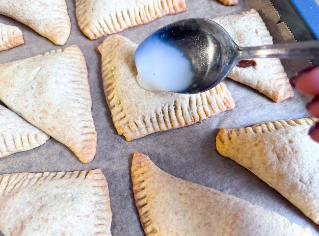 - Verrühre den Puderzucker mit Zitronensaft und streiche die Apfeltaschen damit ein.