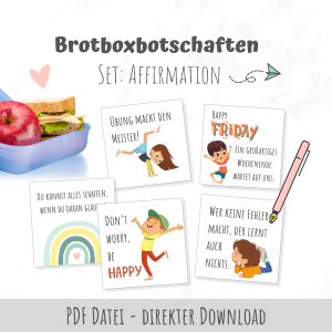 Unsere Brotbox-Botschaften zaubern deinem Kind auf einfache Weise ein Lächeln ins Gesicht. Egal ob eine schwere Arbeit ansteht, der Morgen mal wieder chaotisch verlief oder sich dein Kind in seiner Haut einfach mal unwohl fühlt – mit einer kleinen Brotbox-Botschaft sieht die Welt gleich ein kleines bisschen besser aus. So einfach können Glücksmomente sein und Erinnerungen geschaffen werden.